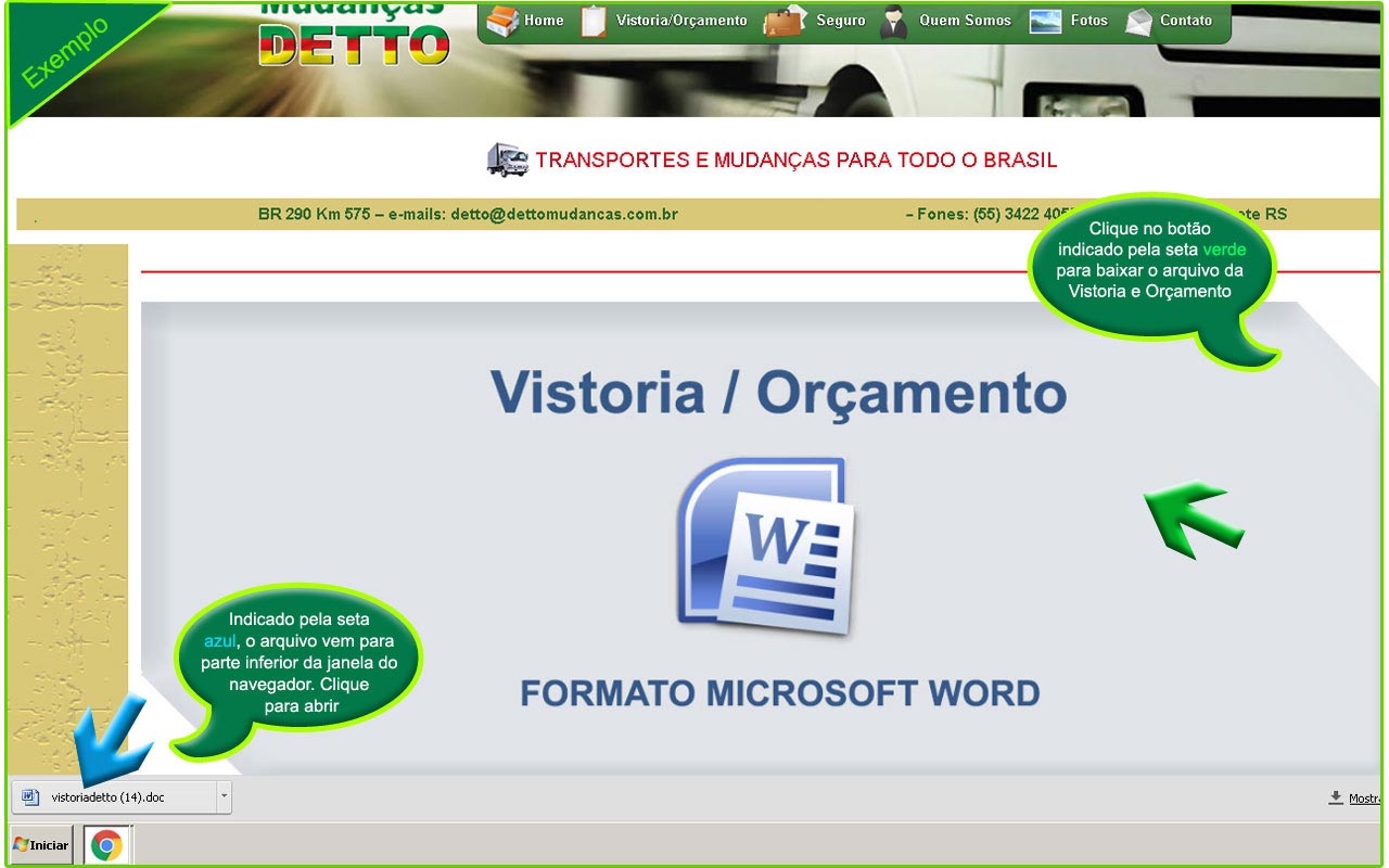 Clique na imagem acima e baixe o arquivo "vistoriadetto.doc" para seu dispositivo (desktop, notebook, tablet ou smartphone). Simplismente clique, o arquivo será aberto, é recomendado já ao abrir, salvar o arquivo. Observe em qual pasta que o arquivo está sendo armazenado. Depois de baixar (abrir o arquivo) procure completar o domumento o máximo possível, envie para o e-mail detto@dettomudancas.com.br.